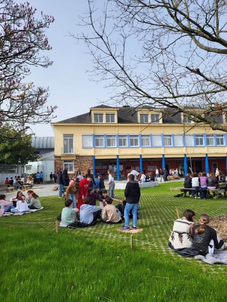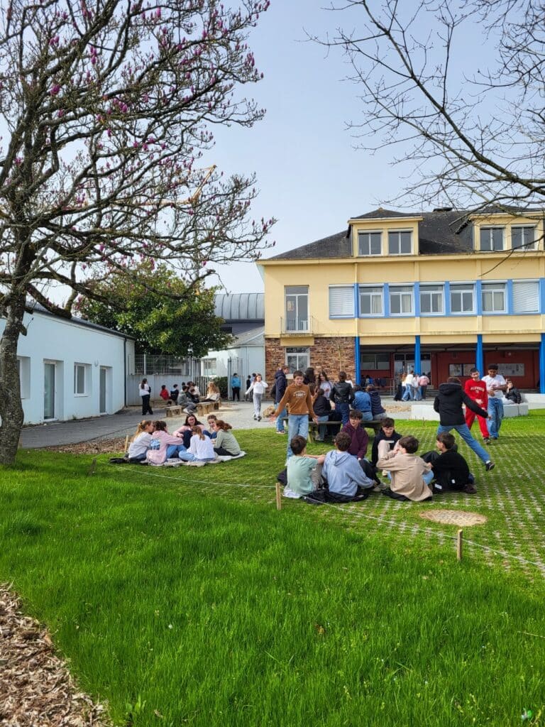 Le printemps s’installe doucement au collège. Le nouvel aménagement de la cour est très apprécié, surtout avec ce beau temps. Sur l’espace vert, chacun profite de la pause méridienne pour se détendre, jouer aux cartes, discuter ou simplement savourer la douceur du moment.