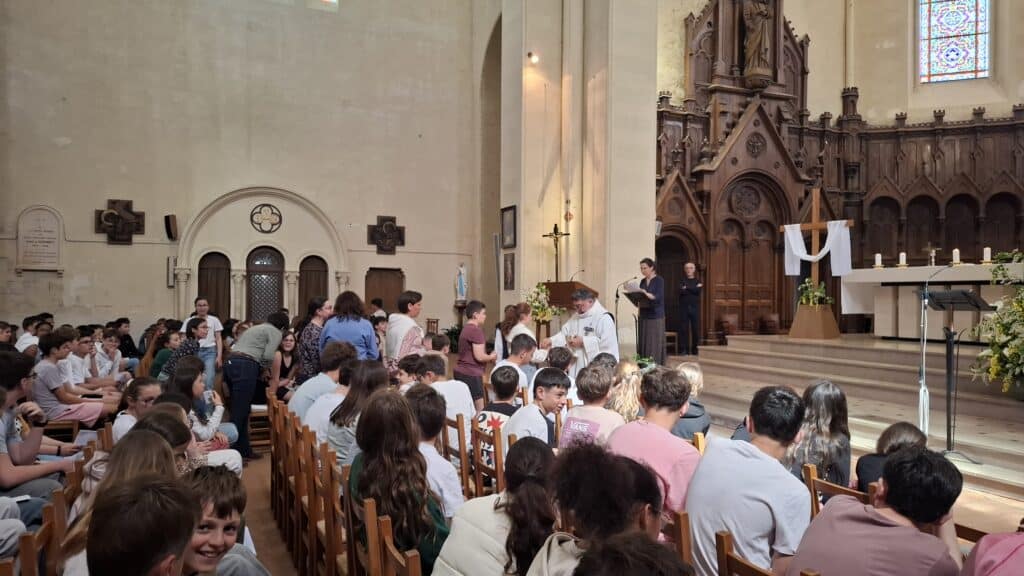 Lors de notre messe de Pâques au collège du jeudi 09 avril, le père Rafaël nous a rappelé que le Christ est pour nous tous, les baptisés et les non-baptisés, pour toi et pour moi … et que nous devons poursuivre les actions du Chris ressuscité dans notre vie ! Plus de 130 jeunes volontaires étaient présents pour prier tous ensemble.