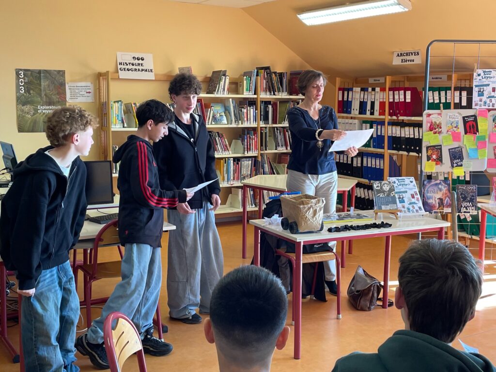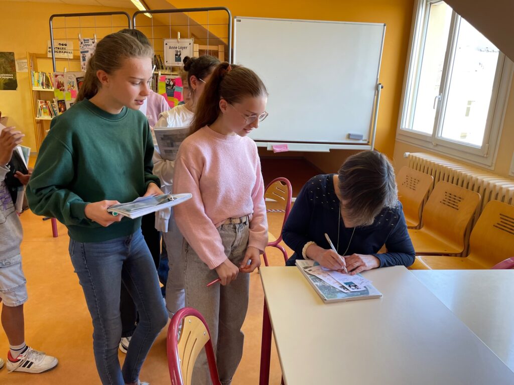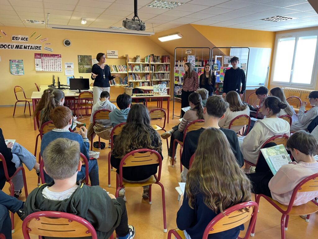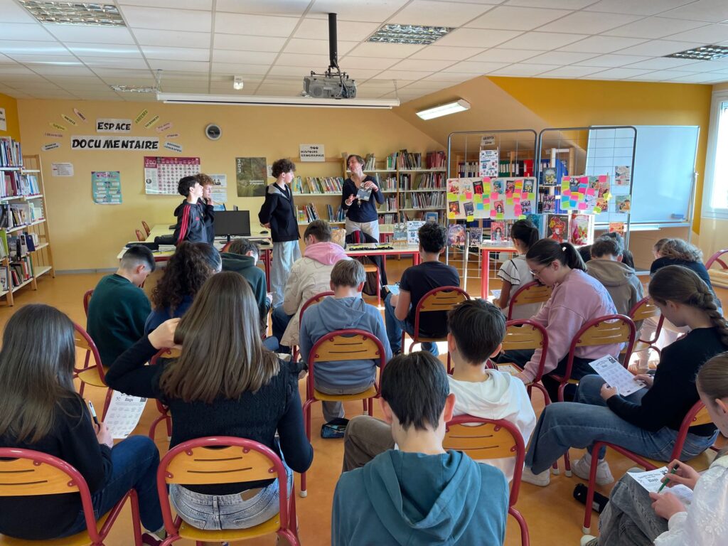 Vendredi 20 mars, les 4 classes de 4e ont eu la chance de rencontrer Anne Loyer, autrice du roman « Charbon bleu » sélectionné au prix VendéeLire auxquels ils participent. A l’aise avec ses interlocuteurs, l’autrice s’est prêtée au jeu du bingo littéraire pour parler sans détours de « Charbon bleu » (son livre qu’elle préfère) mais aussi de la centaine d’autres qu’elle a écrits, pour les enfants et les adolescents. Elle a également partagé des conseils pour écrire et des anecdotes drôles sur ce métier qu’elle exerce depuis quinze ans, mais aussi quelques sources d’inspiration, parmi lesquels ses voyages et sa curiosité pour ce qui l’entoure. Elle n’a pas oublié de mentionner ses auteurs favoris, et certains de ses personnages, souvent des héroïnes, ainsi que les thèmes qui lui tiennent à cœur. Après presque une heure d’échanges, une photo de groupe avec l’autrice et quelques dédicaces ont clôturé ces moments joyeux et sympathiques.